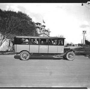 Photo--black and white: Analy Union High School bus No. 1 full of students in driveway with Analy in background, about 1920s.