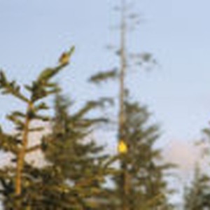 A male and female American goldfinch perched in a pine tree.