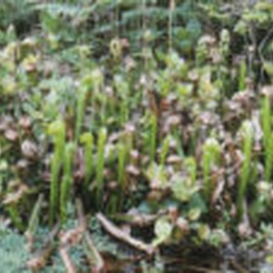 Cluster of bright green and brown wilted California pitcherplants amongst tall grass and other foliage.