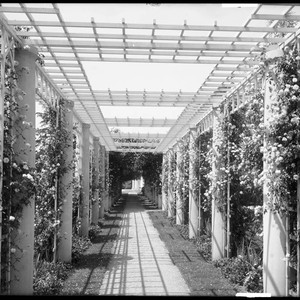 A view of the pergola along one side of the rose garden. Columns line the path, connecting trellises on either side. Roses have grown up the side trellises, but have not yet covered the top.