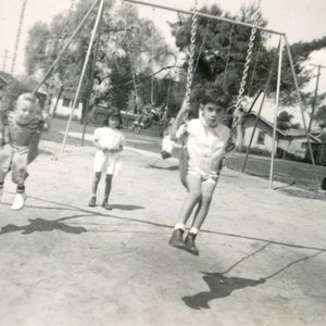 An unidentified child (far left) swings with the Mu�oz siblings, Maria Rosalia (standing), Ricardo (center), and Rosalio (far right) at Laguna Park (now Salazar Park), December 1947; a second swingset is in use behind them.