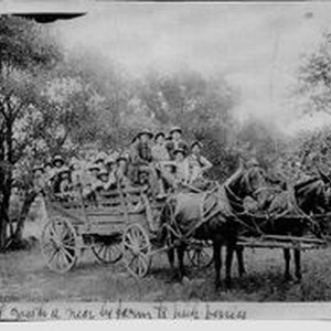 Photo--black and white: Alarge group of children berry pickers in a horse drawn wagon going to a nearby farm to pick berries circa 1910s. The Barlows invited hundreds of children from the Children's Aid Society in San Francisco to camp out, pick berries and earn some spending money. Handwritten caption: "A squad goes to a near by farm to pick berries."