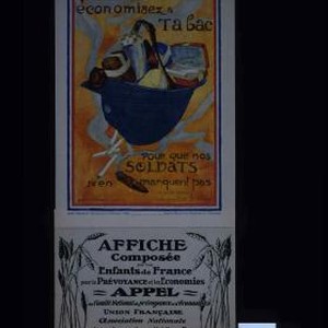 Fumeurs de l'arriere: Economisez le tabac pour que nos soldats n'en manquent pas ... Affiche composee par les enfants de la France pour la prevoyance et les economies. Appel du Comite national de prevoyance et d'economies, Union francaise, Association nationale pour l'expansion morale et materielle de la France