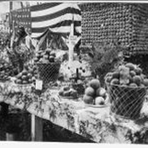 Postcard--photo--black and white: Sebastopol's Gravenstein Apple Show display of plates and baskets of apples on a table decorated with ferns.