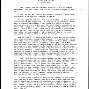 Thought for the day by Charles Handy on Ancient Greek condemnation of hubris and how people should, instead, celebrate doing well; December 17, 1986; Box 18, Folder 2; 1 page