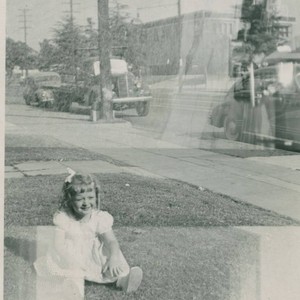 A child named Kathy sits on a lawn on Fourth Street in Boyle Heights in front of three street-parked pre-war vehicles, circa 1946.