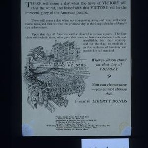 Where will you stand on the day of victory? ... You can choose now - you cannot choose then. Invest in Liberty bonds. Phelps Bridge Corp, New York City, et. al. Verso: "That we here highly resolve that these dead shall not have died in vain." Lincoln, at Gettysburg ... The flower of America is in France today ... Let your heart be your banker. Buy all the Liberty bonds it tells you to. New Jersey Zinc Co., New York City; St. Joseph Lead Co., New York City