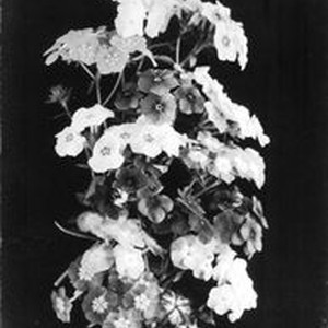 Photo--black and white: Phlox with black background. Caption on back: "Phlox--L.C.S.'s Flower Garden 7/20/26 Keil Colors from white to deep maroon. Including lavender, sulfur yellow and violet."