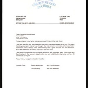 Priscilla Nikomo & Busi Mthembu (Church of God in Christ), Stand No. 280, Ebony Park, Midrand & Post Office Box 1703, Tembisa 1632, letter, [after 2000 September], to Glenda Lewis (Whole truth magazine). [Description English/roman)]