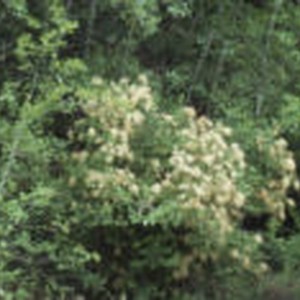 Green shrub with white flowers nestled in with other trees.