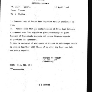 Image / Charles W. Thayer message to Maddox number 1135 regarding Russia-Yugoslav treaty