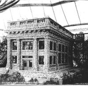 Photo--black and white: The first Sebastopol Apple Show held in a tent across from the Petaluma & Santa Rosa Railway Depot in August, 1910. This display is of the First National Bank of Sebastopol and is made of whole and sliced apples. The Apple Show promoted local apple and fruit. Photographed by Turrill and Miller of San Francisco.
