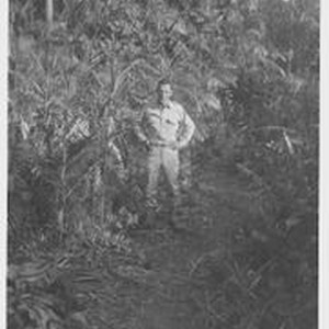 Photo--black and white: Robert Brabec in military uniform in jungle setting circa 1940s.