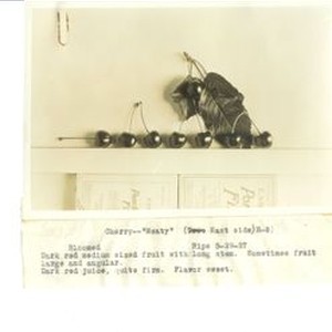Photo--black and white: Identification of Luther Burbank cherry hybrid from the Gold Ridge Experiment Farm. Single cherries in row with leaf above. Information attached: "Cherry--"Meaty" (Tree East side) H-8) Bloomed [blank] Ripe 5-29-27 Dark red medium sized fruit with long stem. Sometimes fruit large and angular. Dark red juice, quite firm. Flavor sweet. "