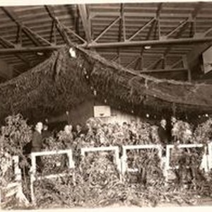 Photo--black and white: High School celebration in gymnasium. Only young men are visible behind decorations of greenery draped white barriers. Over ceiling of gym greenery is draped over netting. This is possibly Analy Union High School.