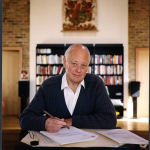 Color photo of Charles Handy at a desk, taken by Elizabeth Handy. Charles is staring directly into the camera lens, and holding a wooden pencil with papers and a pair of reading glasses in front of him. There is a bookshelf in the background.