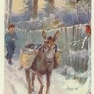 Postcard--color print: Christmas message. Scene of wooded path with boy following donkey. Handwritten message on verso from a Margurite to Mary Guisler of Coalinga. Mary was originally from Graton.