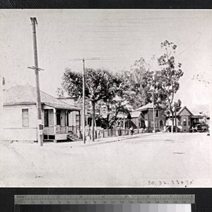 View of houses with fenced-in yards and trees on Bauchet Street near Old Chinatown in Los Angeles.