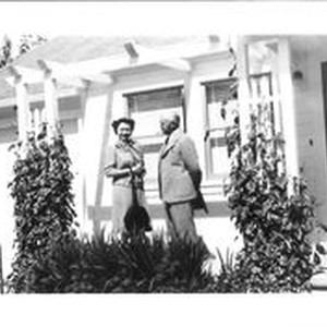 Photo--black and white: Bunni Myers, left, and her father Charles R. Myers, about 1940s standing in front of a house. Charles Myers was the owner of Sebastopol business Art Point Studios from 1917 to 1966.