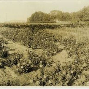 Photo--black and white: Field of zinnias with shed and silo in background at Ignacio California, 1931. Photographer Gasberg of San Rafael in lower right corner.