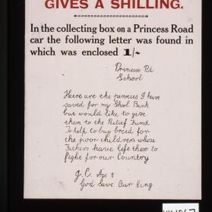 A little school boy gives a shilling. In the collecting box on a Princess Road car the following letter was found in which was enclosed 1 pound