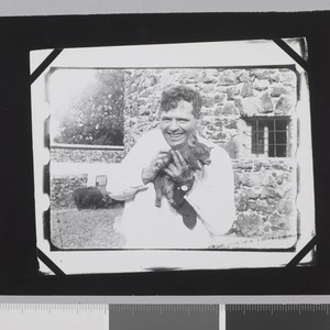 Jack London holds a piglet and smiles in the piggery on the ranch.