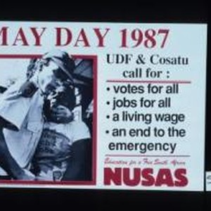 May Day 1987. UDF & Cosatu call for: votes for all, jobs ... Education for a Free South Africa NUSAS