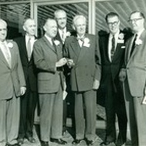 Mr. Whitsett and group of six men in front of unidentified Valley Federal Savings and Loan.