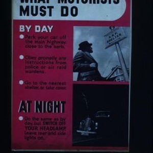 In an air raid, what motorists must do. By day, park your car off the main highway, close to the kerb ... at night do the same as by day, but switch off your headlamp. Leave rear and side lights on
