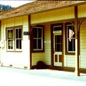 Slide, Eastman Color Transparency: Close-up of the Duncans Mills historic Railroad Depot, April, 1983. Winner of Preservation Award in 1979.