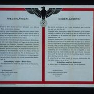 Niederlander! Der Kampf in Osten ist fur Euch kein Schauspiel ... sondern Euer Schicksal. ... Ich entspreche diesem Wunsche und rufe alle einsatzbereiten Niederlander auf, im Freiwilligen Legion Niederlande gegen den Bolschewismus und fur das eigene Volk und Vaterland zu kampfen. Der Reichskommissar fur die besetzen niederlandischen Gebiete, Seyss-Inquart, Reichsminister