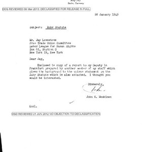 John K. Meskimen letter to Lovestone, with attached report on the trade union statement on the Ruhr Statute