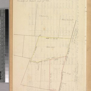 This and the rest of the maps are bound in folder: "Goodwin et al vs. Rowland, Survey of Rancho la Puente..." p. 24; color highlighting, courses, distances, acreage; penciled calculations & notations. Title supplied by cataloger.