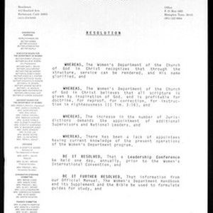 Women’s International Convention, Church of God in Christ, 1987 August 28, resolution regarding attendance at meetings. [Description English/roman)]
