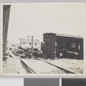 A three-walled shack containing workbenches, clothing, and rags, a pile of building materials and a cast iron range. A small house and windmill sits behind it. Title and date transcribed from envelope.
