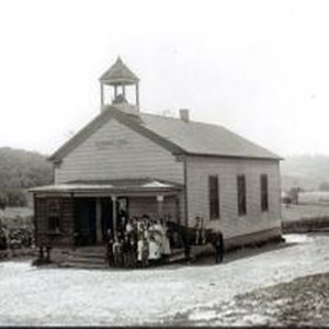 Photo--black and white: Spring Hill School (1872-1958) in 1900. The students and teacher stand on the school steps and two children are on horse back. The school was closed down in 1958 and combined with Pleasant Hill school into Twin Hills School.