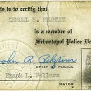 Sebastopol Police Officer Lemual "Shorty" Plumley's ID card signed by Chief of Police John R. Pilgrim and Mayor Frank L. Fellers with Plumley's fingerprint