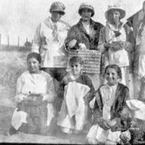 Photo--black and white: A group of eight girls, probably the birthday party group with Blanche Riddell, 1916.