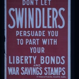Don't let swindlers persuade you to part with your Liberty bonds and war savings stamps. By order of Federal Reserve Bank