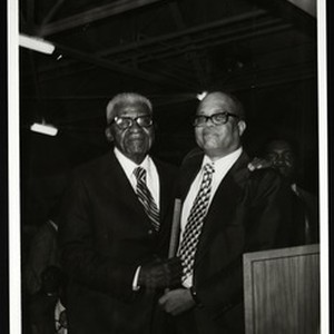 Photograph of 2 men at a podium with a Church of God in Christ award, Chicago, Illinois, 1961 July. From Corby Bush? "Photography, motion pictures, Ted Bell of Chicago, Jul. 1961, 4725 S. Park Ph. DR 3-8533, mobile ph. RA 6-4516, car 27, Chicago 15, Ill." -- stamped on back. [Description English/roman)]
