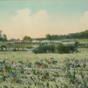 Postcard- hand-colored photo of Luther Burbank Experiment Farm with rows of flowers. circa 1900. Back caption: Luther Burbanks experimental grounds, Sebastopol, Cal." M. Rieder, Publ, Los Angeles, Cal 20071 Made in Germany.