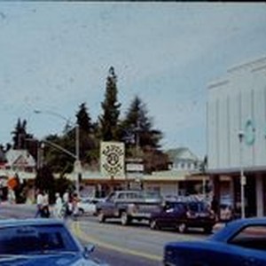 Print, color: View north from Carlson's on Main Street Sebastopol circa 1970s, now North Main Street. The Circle R Ranch Mart super market is seen at the corner of Main and McKinley Streets.