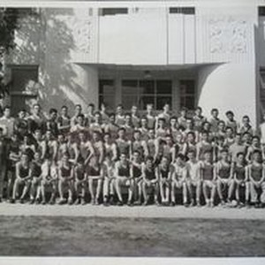 Photo--Black and white: Analy High School Track Team of 1949 taken in front of the school. Walt Foster is man in light jacket, right top row.