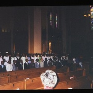 Photograph of a large group of children at the front of an unidentified Church of God in Christ sanctuary, [s.d.]. From Corby Bush? [Description English/roman)]