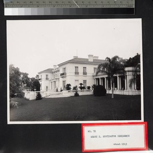 View of the loggia and south terrace of the residence, from the southeast. The vines have not yet started to cover the south façade. The label that accompanies this photo in the album reads "No. 72 Henry E. Huntington residence, about 1913."