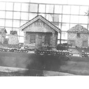 Postcard--black and white: A 1912 Gravenstein Apple Show exhibit of a miniature farm house with windmill and well made of apples.