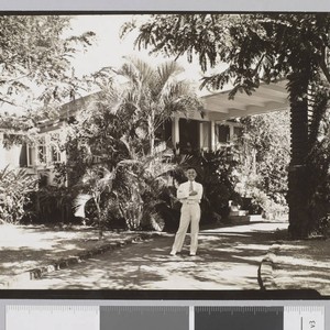 Jack London's former valet, Yoshimatsu Nakata, stands in the driveway of his home in Hawaii. Title and date transcribed from envelope. Copy print of original. Verso of photo reads: "Dr. Nakata at his home in Kaimuki."