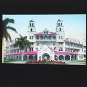 Glass photographs -many in color- of Southern California scenes. They include Pasadena views (homes, a school, a church), Mt. Lowe, poppy fields, sunset over the Pacific, San Gabriel Mission, Catalina Island, Los Angeles (Eastlake Park), hauling cotton in Imperial Valley, San Luis Rey arches, headwaters of Owens River.