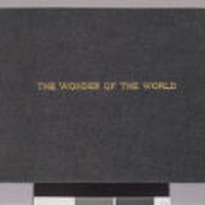 Bound in textured black material. The title, "The Wonder of the World," is embossed in center of cover in gold lettering. The number "90" is affixed to the top of spine with glue. Images are a random mix of clippings of WWI era military equipment, current events of the time, and a few photos. Very light wear and scuffing over surface and edges. Album is only filled through page 30, and as this album contains primarily clippings dating after Jack London's death, it was decided to scan only the pages with content and not the enter object.