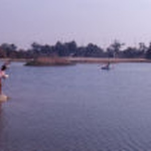 Harrol Doss and Helena Aldvich dipnetting on the Bernard Field Station lake, with boats in sight.